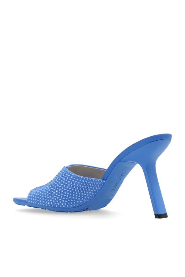 Blue ‘Petal’ mules from Loewe. Made of leather, this model sits on a blue rubber sole and showcases a suede upper strap accentuated with crystals, the iconic petal-shaped toe and an asymmetrical heel with a glistening trim.