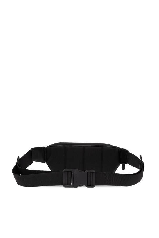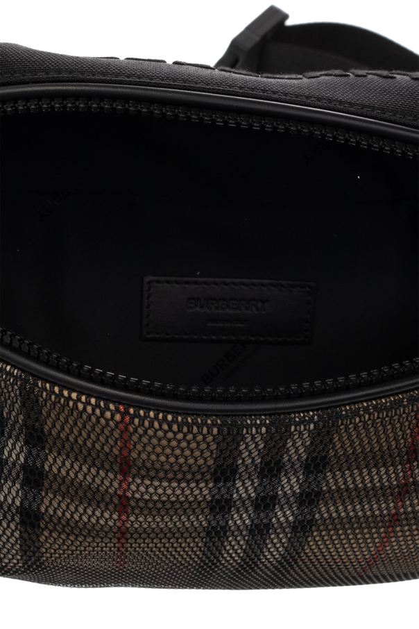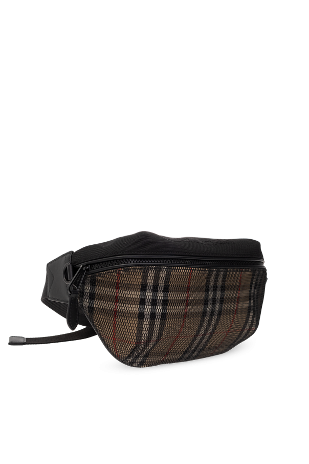 Black and beige ‘Sonny’ belt bag from Burberry. Crafted from canvas and trimmed with mesh and calf leather, this design fastens with a zip and showcases the brand's signature check pattern and logo embroidery. It is complete with an adjustable strap with a buckle and one internal compartment.