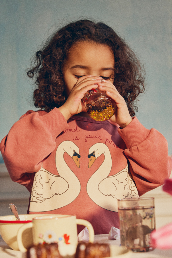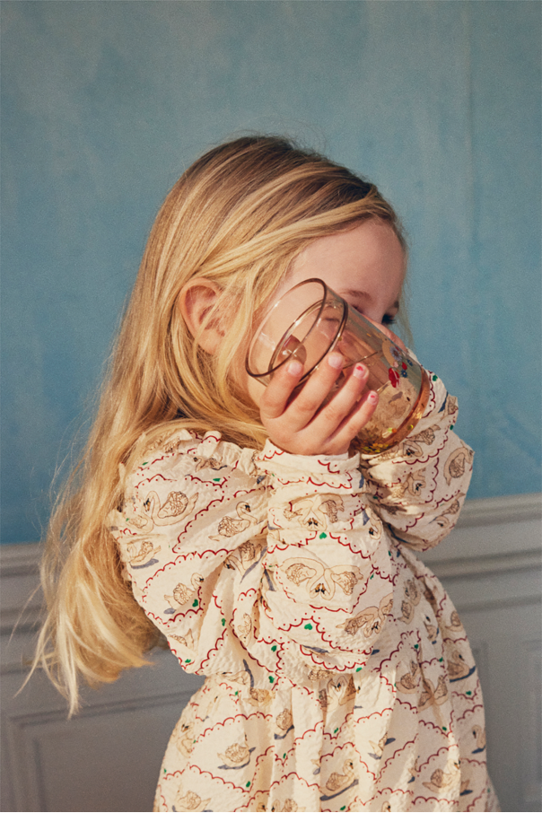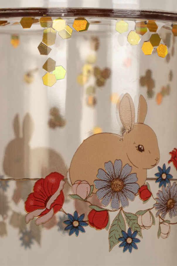 Set of two transparent beige cups from Konges Slojd. Embellished with a motif of a rabbit and flowers, they are filled with distilled water with sparkling glitter.