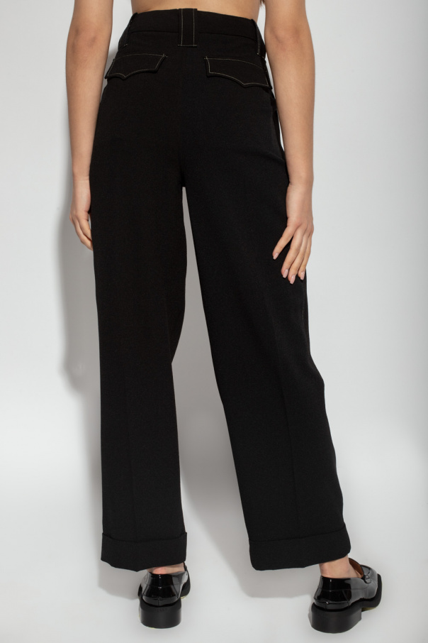 Black trousers from Ganni. Cut with a loose-fitting silhouette with wide legs, this pair features a zip fly with a button and hooks, two front slip pockets, two back flapped pockets, distinctive pleats at the waist and turn-up cuffs.
