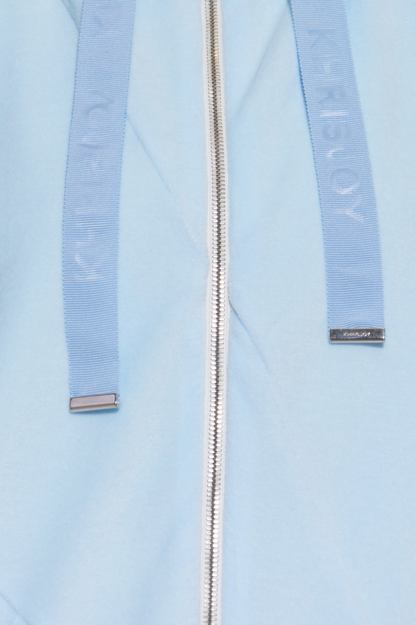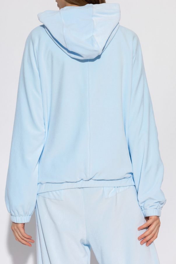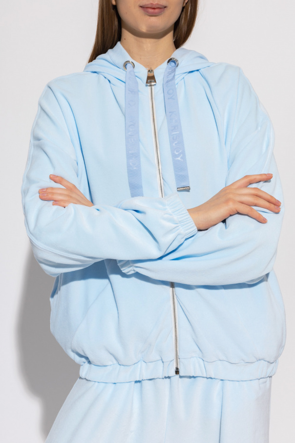 Light blue hoodie from Khrisjoy. Made of velour, this garment features a hood with drawstrings with a logo, two front pockets and ribbed trims at the hem and cuffs.