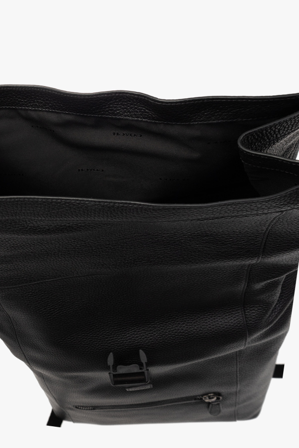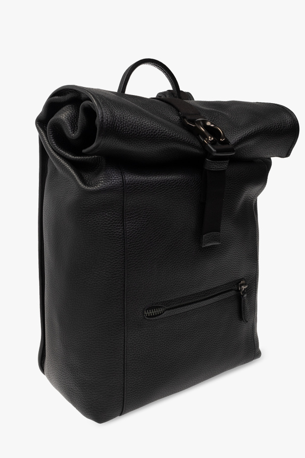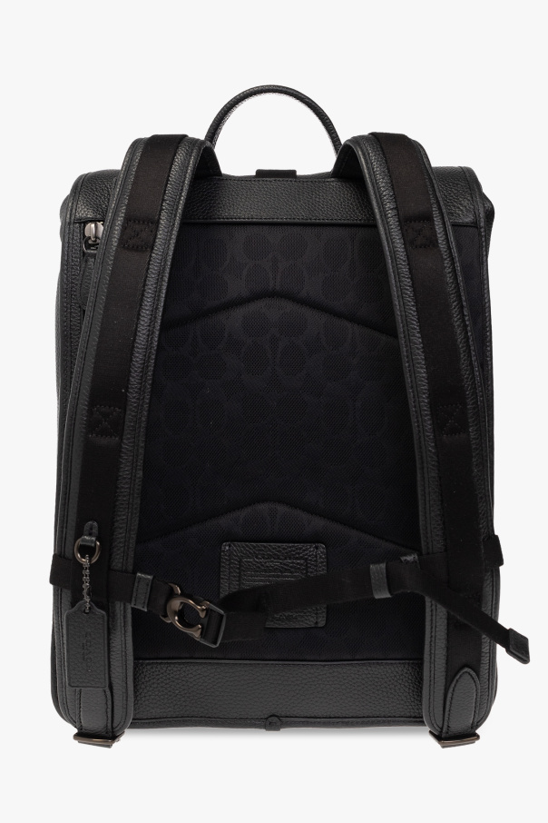 Black backpack from Coach. Made of leather, this model features a folded top with a snap-fastened snap and monogram detail, zipped back pocket, zip fastening at the back, half-round handle, adjustable shoulder straps with link, dark silver-tone metal hardware and one internal compartment with three slip pockets and one zip pocket.