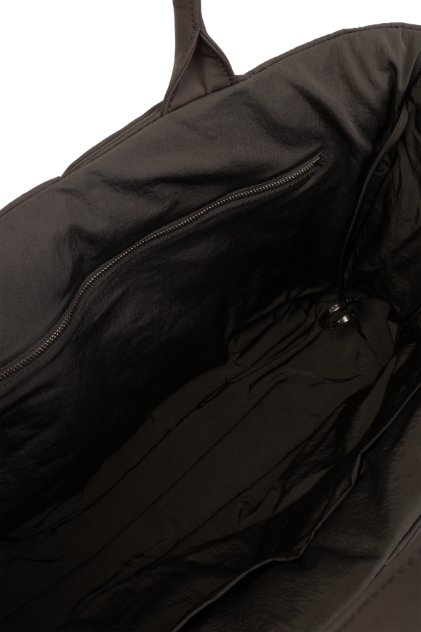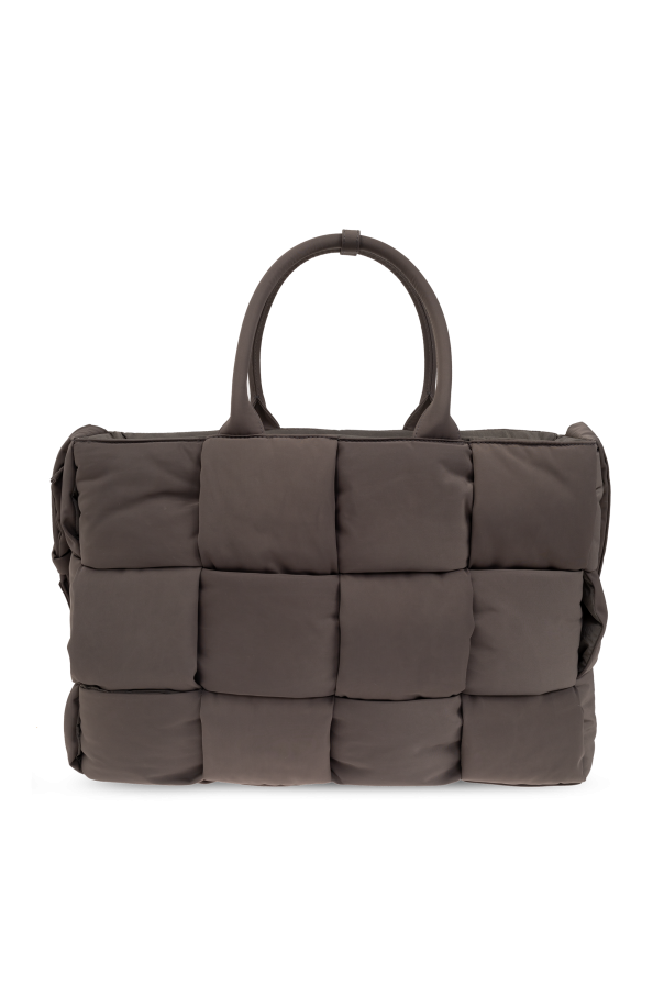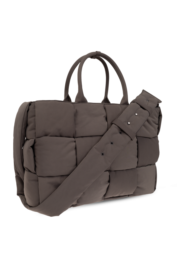 Introducing the ‘Arco Large’ Shopper Bag by Bottega Veneta, a paragon of sophistication and practicality. Crafted from a 100% polyamide technical fabric derived from recycled plastic bottles, this dark grey tote exemplifies luxury with a conscious edge. Its weather-resistant and durable nature makes it a versatile companion for any setting, enhanced by the brand's iconic ‘Intreccio’ weave that adds a touch of artisanal craftsmanship. The bag's quilted structure not only provides an original aesthetic but also hints at enhanced durability and protection for your essentials. It features two robust handles for hand or shoulder carry, complemented by a detachable and adjustable shoulder strap, offering versatility in wear. A secure zippered main compartment, adorned with button or riveted details on one of the straps, ensures the safety of your belongings, while inside, a trio of pockets—one zippered and two slip—along with a key leash, keep your items organized. Why purchase this product? Exclusive Design: Emanating from the esteemed house of Bottega Veneta, this bag’s refined appearance and craftsmanship denote its luxury lineage. Environmentally Friendly: Made from recycled materials, it's a stylish choice that supports sustainability. Practical Elegance: With its resilient material, ample storage, and adjustable carrying options, it meets the needs of the modern man without compromising on style. Universal Appeal: The universal grey tone and timeless design ensure it complements any outfit, making it a practical addition to any wardrobe.