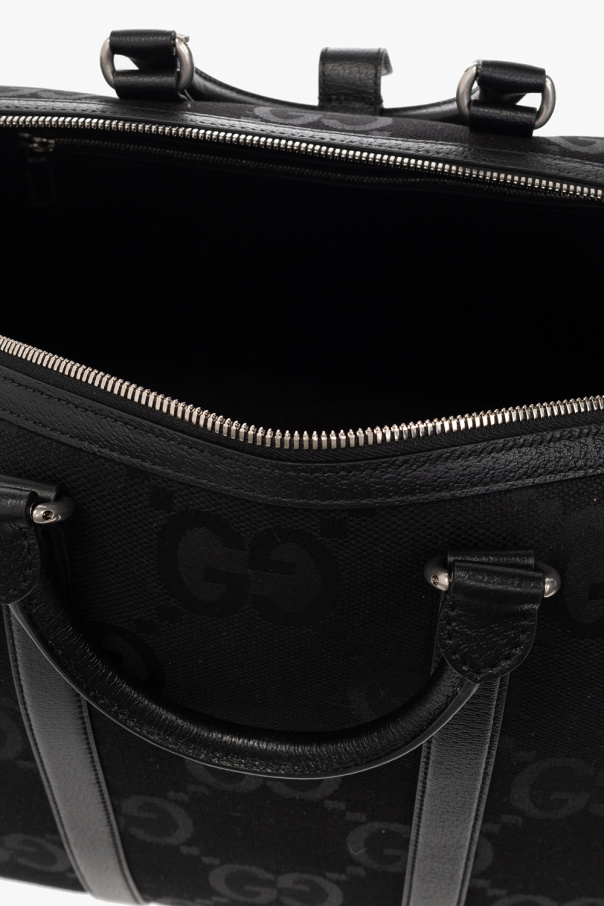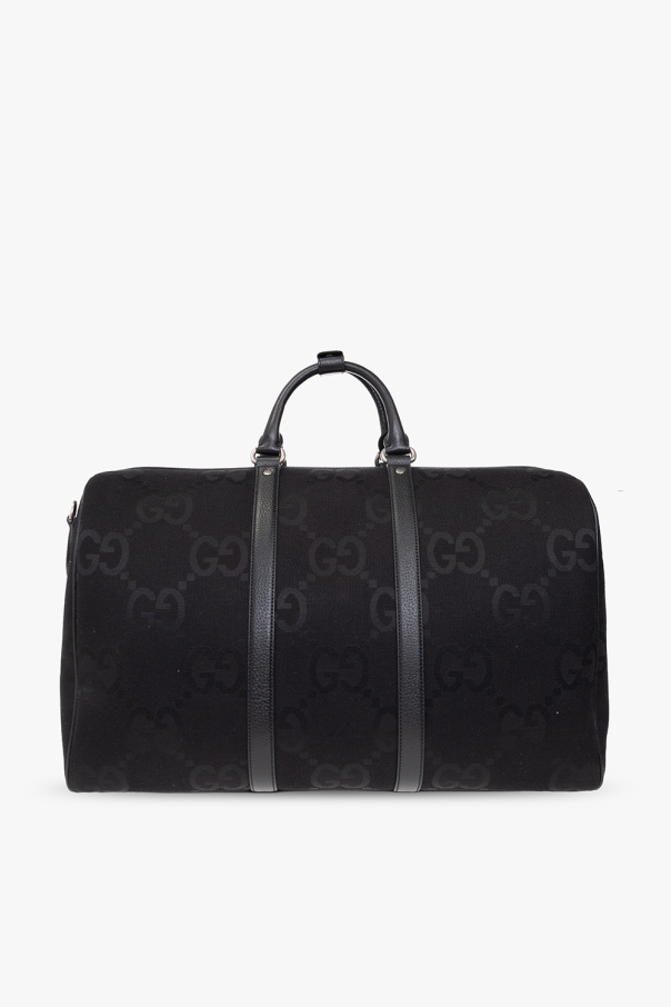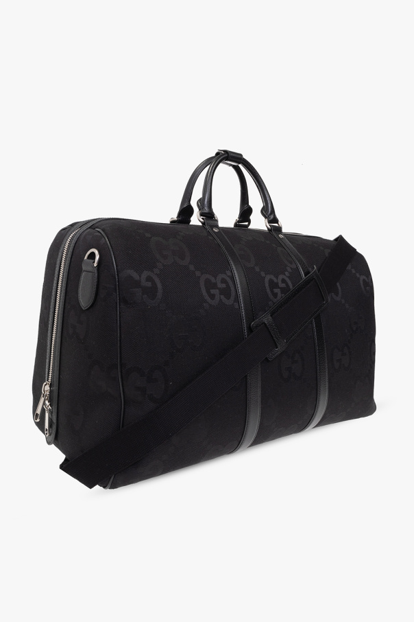 Black duffel bag from Gucci. Crafted from the brand's signature ‘GG Jumbo’ canvas and trimmed with calf leather, this design fastens with a two-way zipper and features a detachable and adjustable shoulder strap, two handles with snap straps, an attached padlock, ID tag and keyed pendant, silver-tone metal hardware and one internal compartment with two zip pockets.