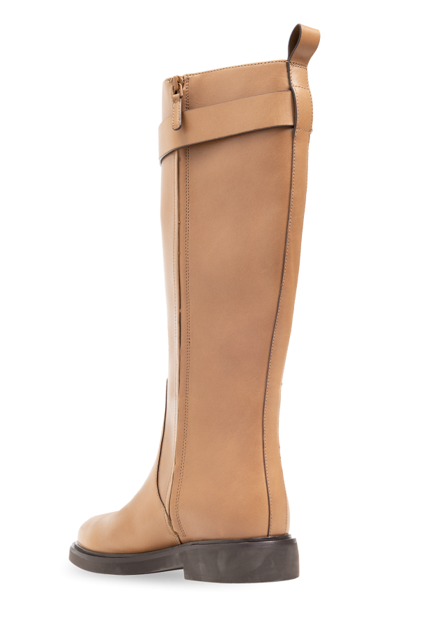 Light brown knee-high boots from Tory Burch. Made of leather with a round toe, this model sits on a dark brown rubber sole and features a side zip accompanied by a velcro-fastened strap and a tactile logo.