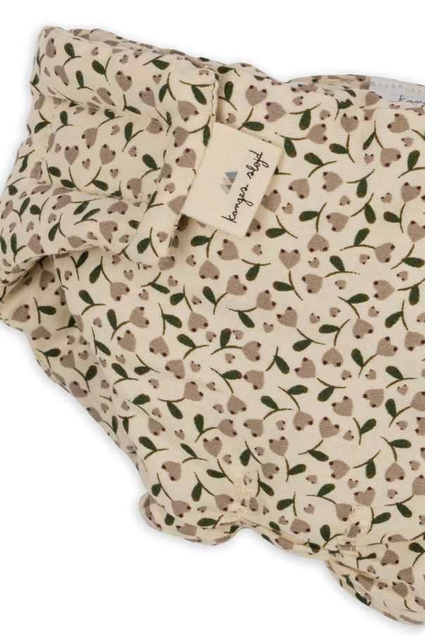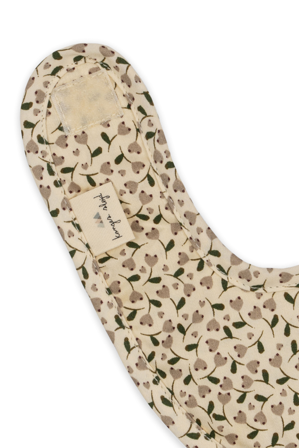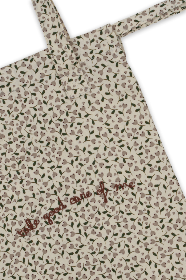 Cream doll nursery set from Konges Slojd. Made from organic cotton and decorated with a floral pattern and embroidered brown writing, this set includes a bib, diaper and muslin cloth. Comes with a tie carry bag.
