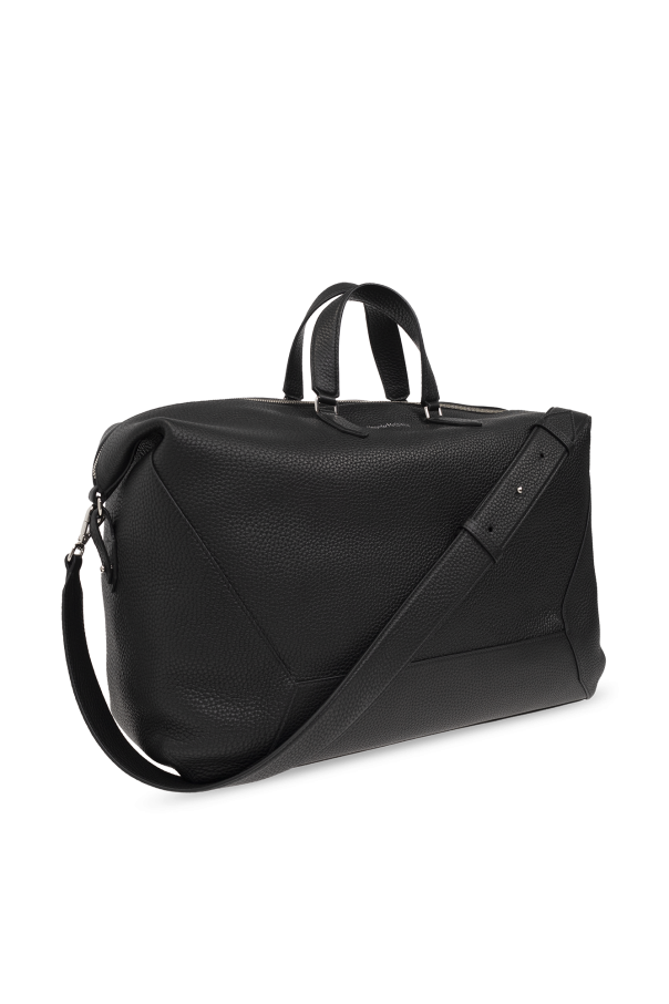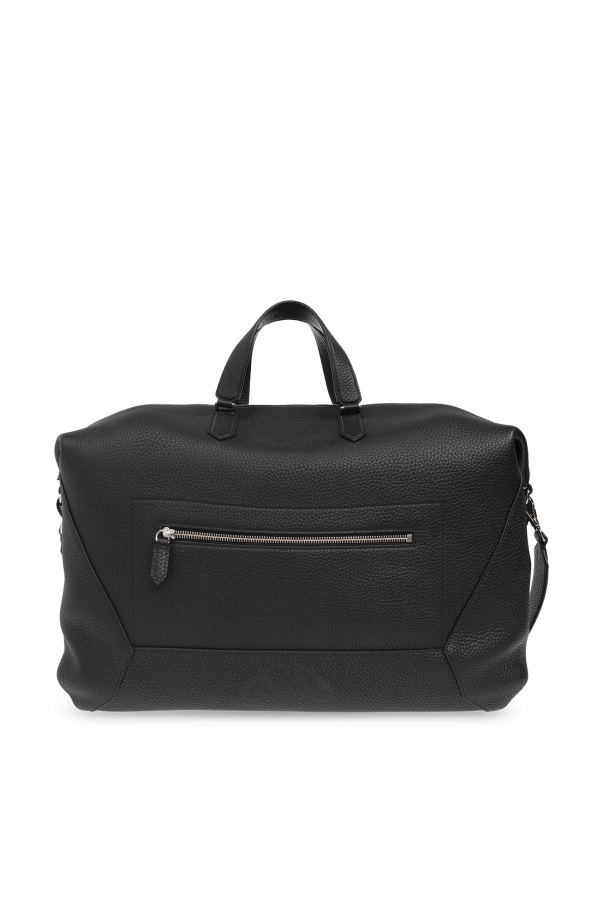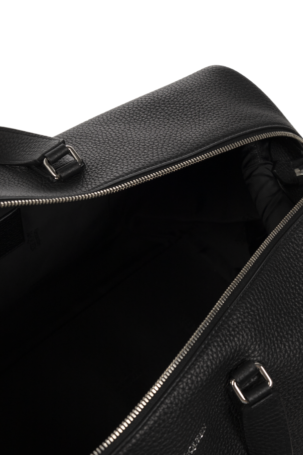 Black duffel bag from Alexander McQueen. Made of leather, this design fastens with a two-way zipper and showcases a logo pattern. It is complete with a shoulder strap, two half-round handles, silver-tone metal hardware and one internal compartment with one slip pocket.