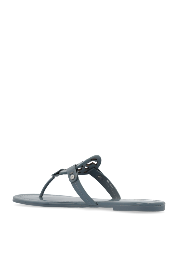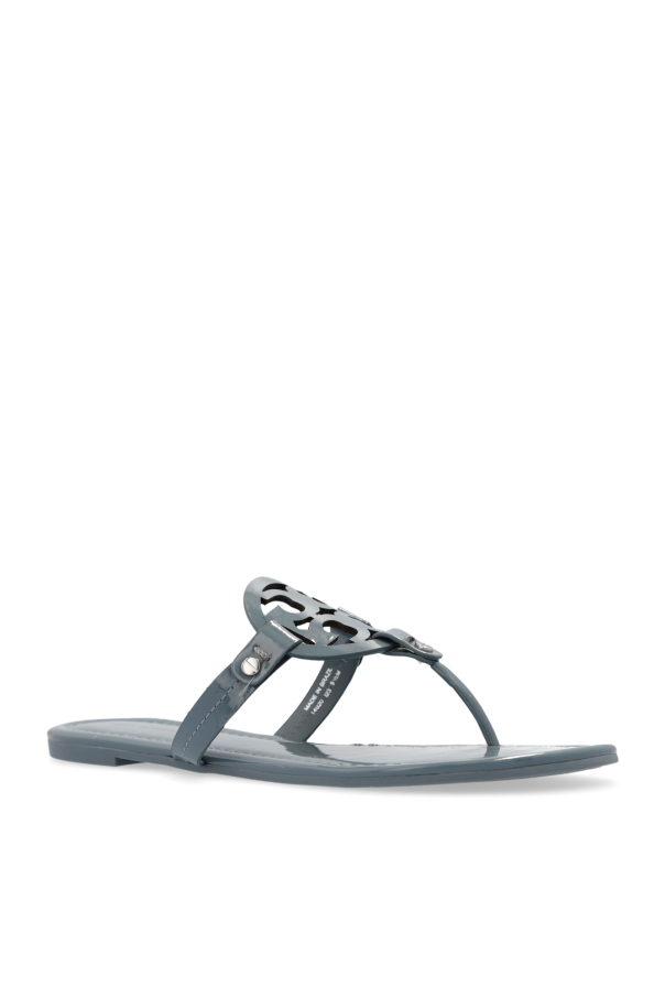 Bluish grey ‘Miller’ flip-flops from Tory Burch. Made of patent leather, this pair features a logo and a rubber sole in bluish grey.
