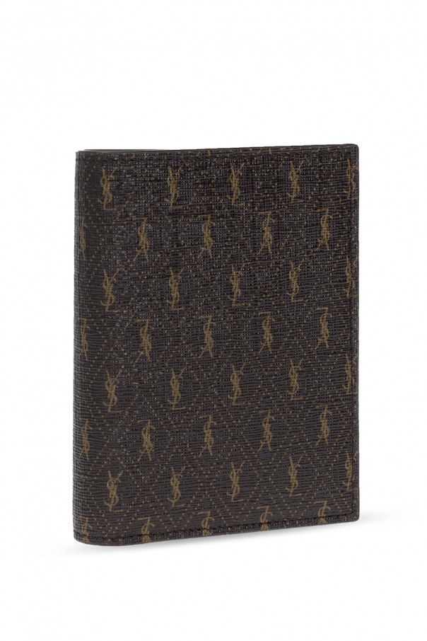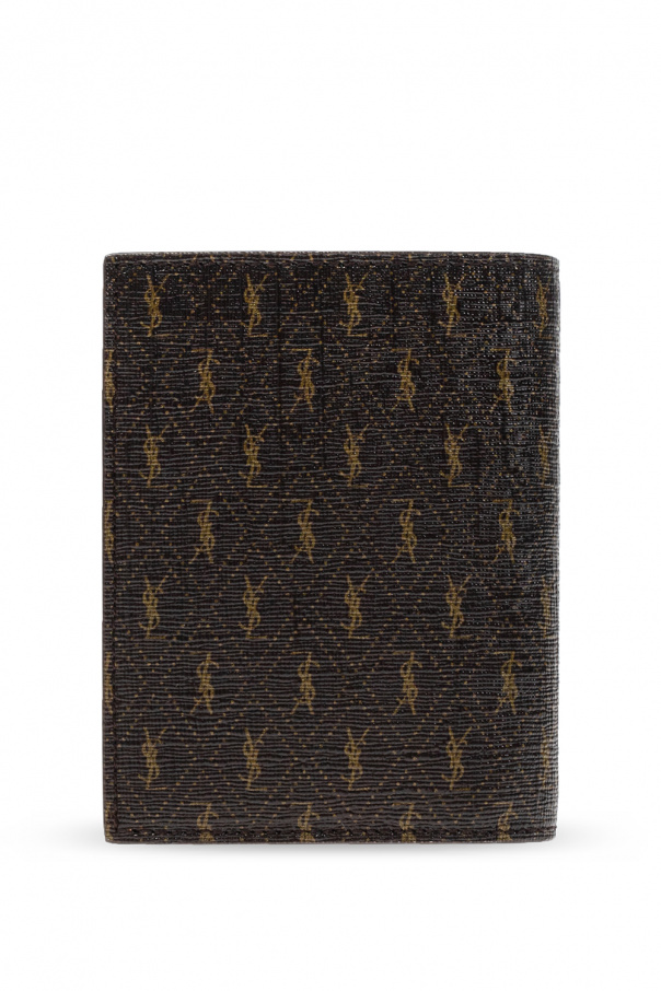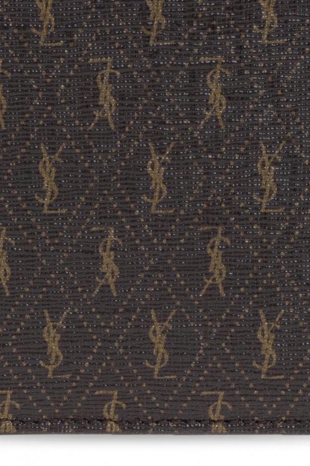 Dark brown bi-fold wallet from Saint Laurent. Embellished with a gold-tone monogram pattern, this design features a brown leather-clad interior with a bill compartment, two slip pockets and four card slots.