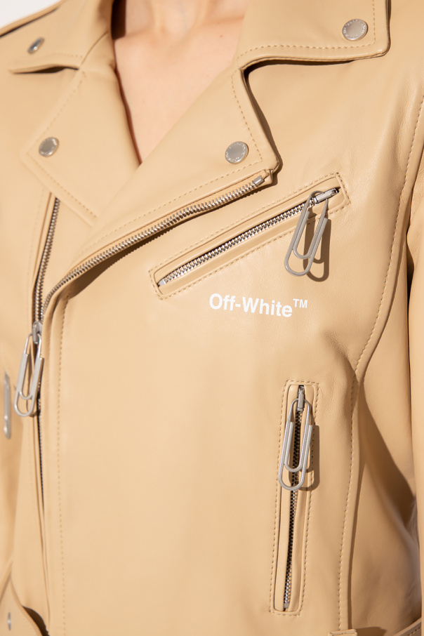Beige biker jacket from Off-White. Made of leather, this garment features a two-way zip with the label’s signature paper clip charm, adjustable buckle strap, white logo print, three zip pockets, snap-fastened epaulettes on the shoulders, white Diagonal logo at the back, long sleeves with zips and silver-tone metal hardware.