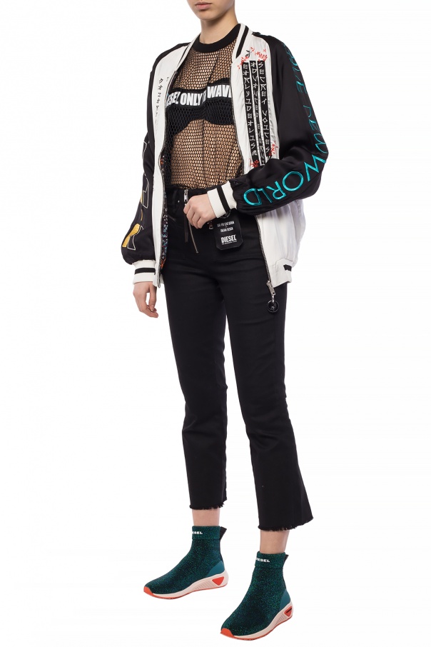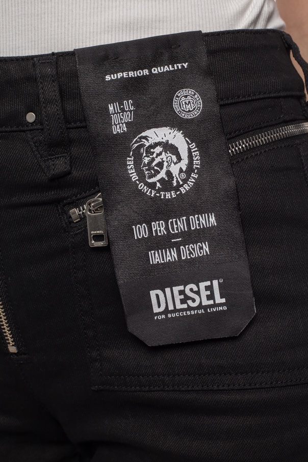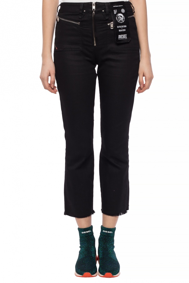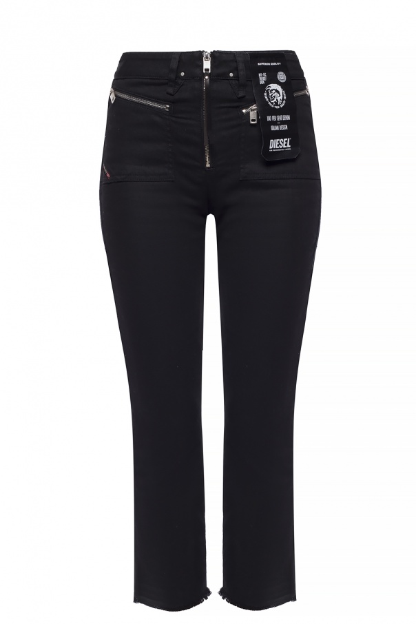 Black jeans, 'D-Astie' model from Diesel. Fastened with buttons and a zipper. Four pockets: two zippered on the front and two inset on the back. Extended legs with 7/8 length and a raw finish.