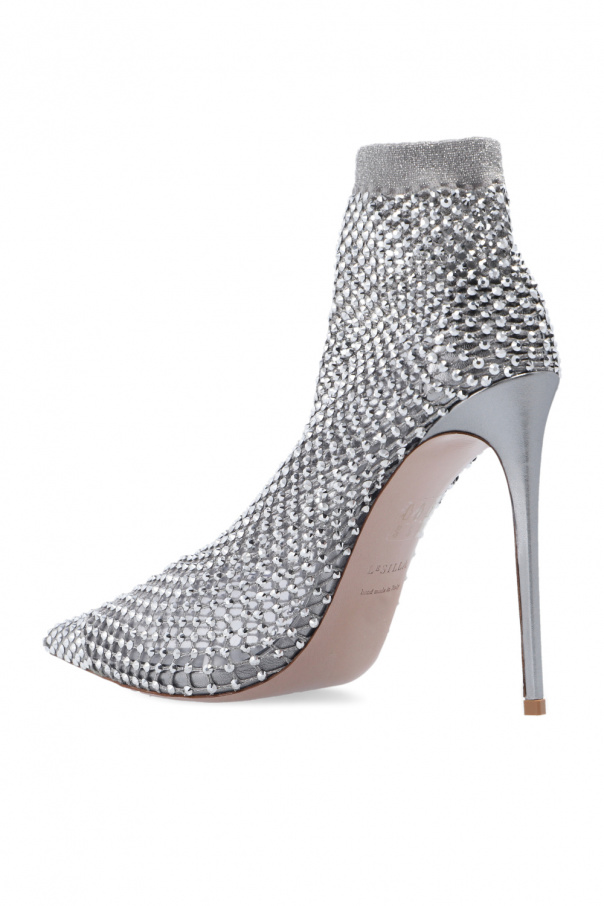 Silver-tone ‘Gilda’ sock pumps from Le Silla. Made of mesh embellished with crystals and lurex threads, this pointed toe design features ribbed trims and cream leather sole with rubber trims.