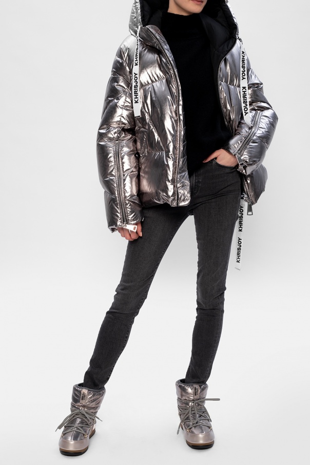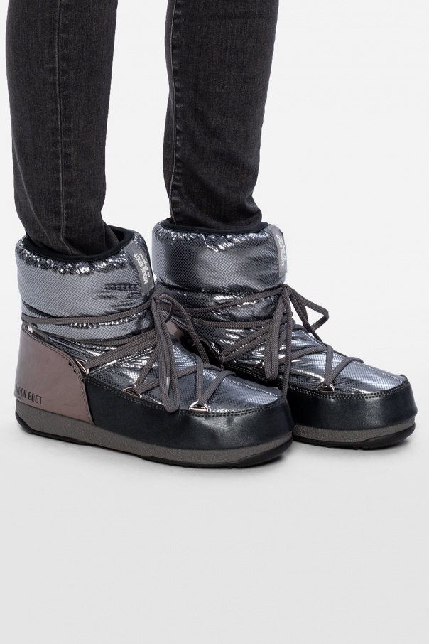 Silver-tone ‘St. Moritz Low’ snow boots from Moon Boot. Resting on a grey and black rubber sole, this design is complete with a logo appliqué, printed pattern and silver-tone metal hardware. Inspired by the peculiar shape and technology of the astronauts' boots, the iconic style was designed in 1969 after the first Moon landing.