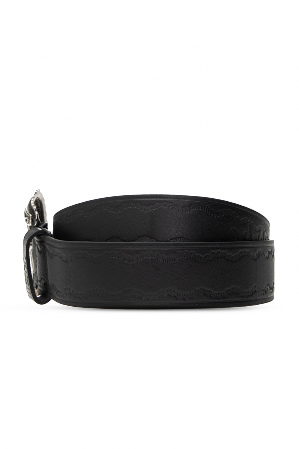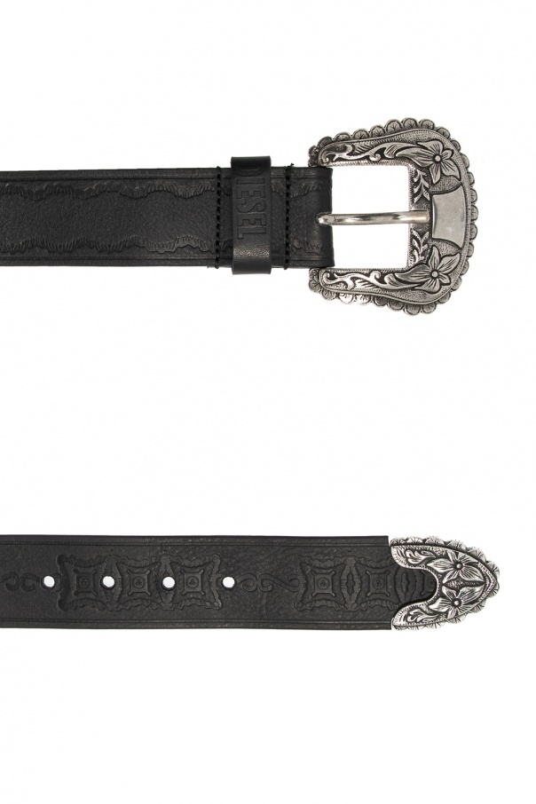 Black belt from Diesel. Made of cow leather, this item fastens with an embossed pattern and a decorative buckle in antiqued silver-tone.