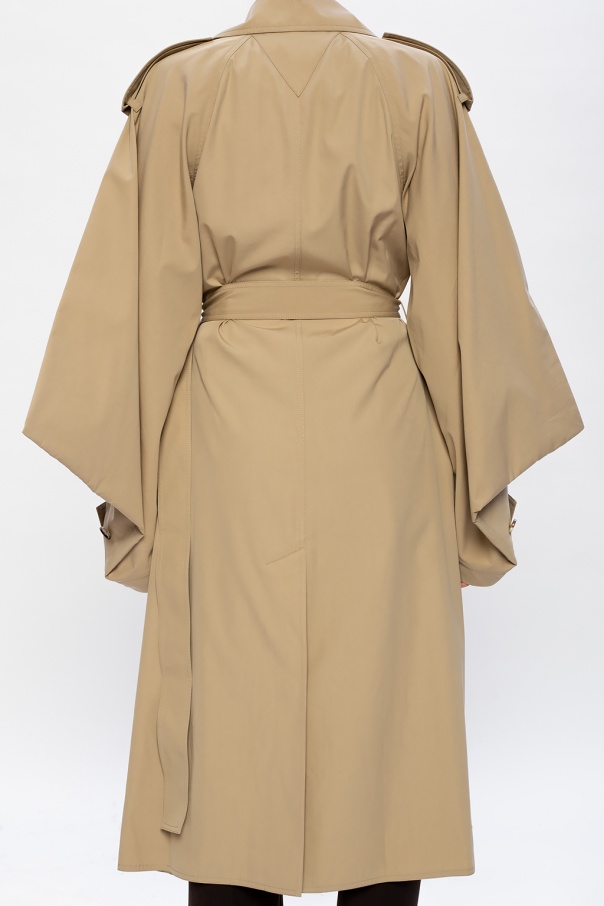 Beige double-breasted trench coat from Bottega Veneta. Crafted from cotton, this garment features button fastening, detachable buckle belt, decorative sleeves with zip details and two slip pockets.
