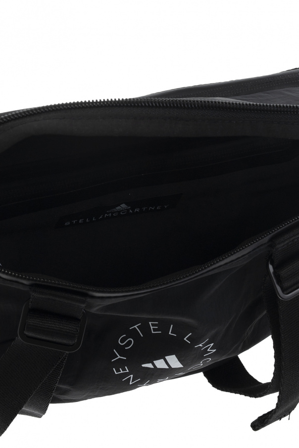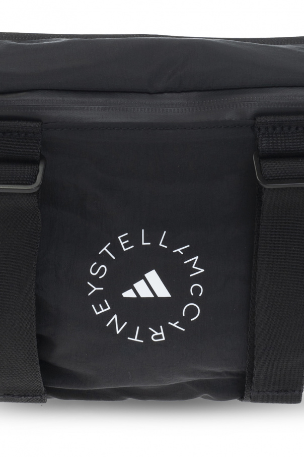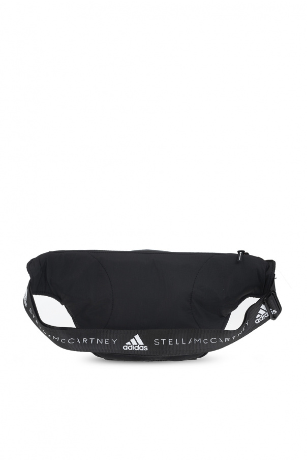 Black belt bag from ADIDAS by Stella McCartney. Made of recycled material. Closed with a zipper. Adjustable belt decorated with embroidered white logo. A compartment with a zipped pocket on the inside. On the back, a pocket with a removable drawstring bag.