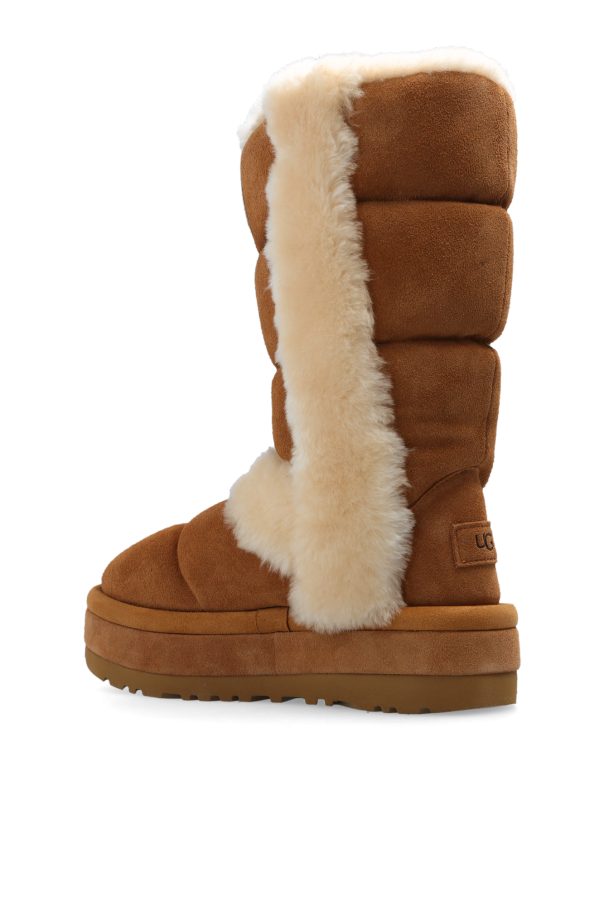 Brown ‘Classic Chillapeak’ quilted snow boots from UGG. Crafted from suede with cream sheep fur trims, this pair features a decorative detail on the front, logo patch at the back, UGGplush™ lining made from wool and recycled materials as well as a brown EVA foam sole.