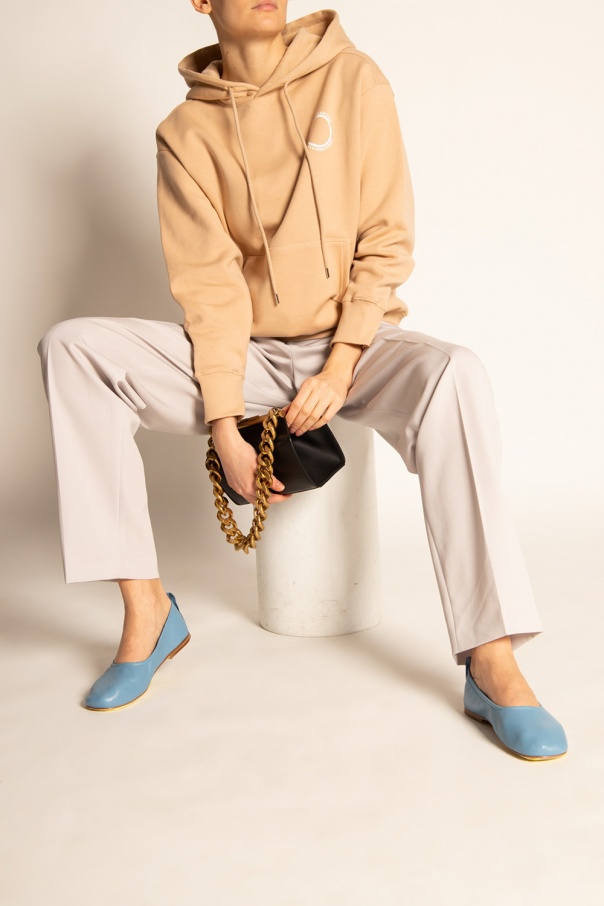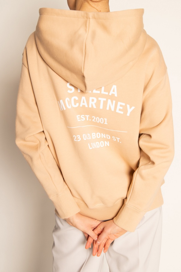 Beige sweatshirt with a drawcord-adjustable hood from Stella McCartney. Crafted from cotton jersey with an oversize silhouette, this hoodie features a kangaroo pocket and a white logo print on the front and ribbed finishes at the bottom hem and cuffs.