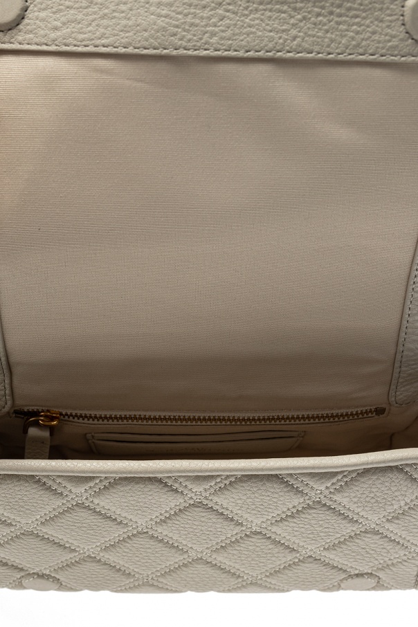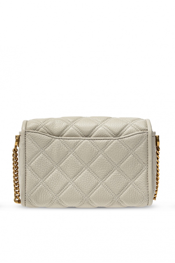 Beige quilted shoulder bag from Marc Jacobs (The). Crafted from leather, this design features a magnetic snap fastening, logo detail, chain shoulder strap, magnetic snap pocket at the back and gold-tone metal hardware. The interior is lined with beige fabric and includes a zip pocket and two card slots.