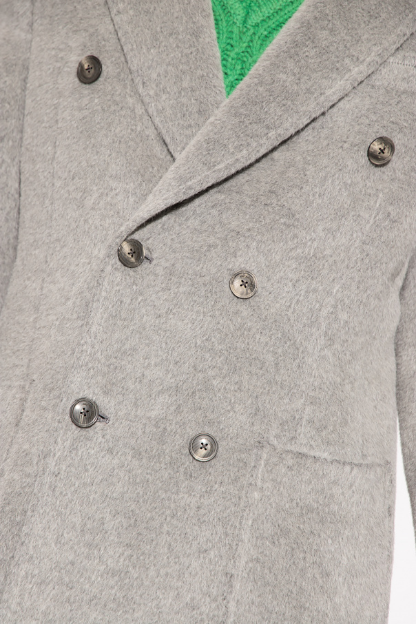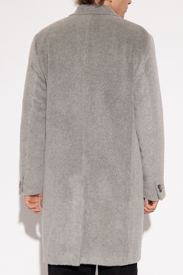 Grey coat from Emporio Armani. Crafted from a wool and alpaca wool blend, this style features a double-breasted silhouette, button fastenings, a collar with peak lapels, three slip pockets, a single back vent and long sleeves with button cuffs.