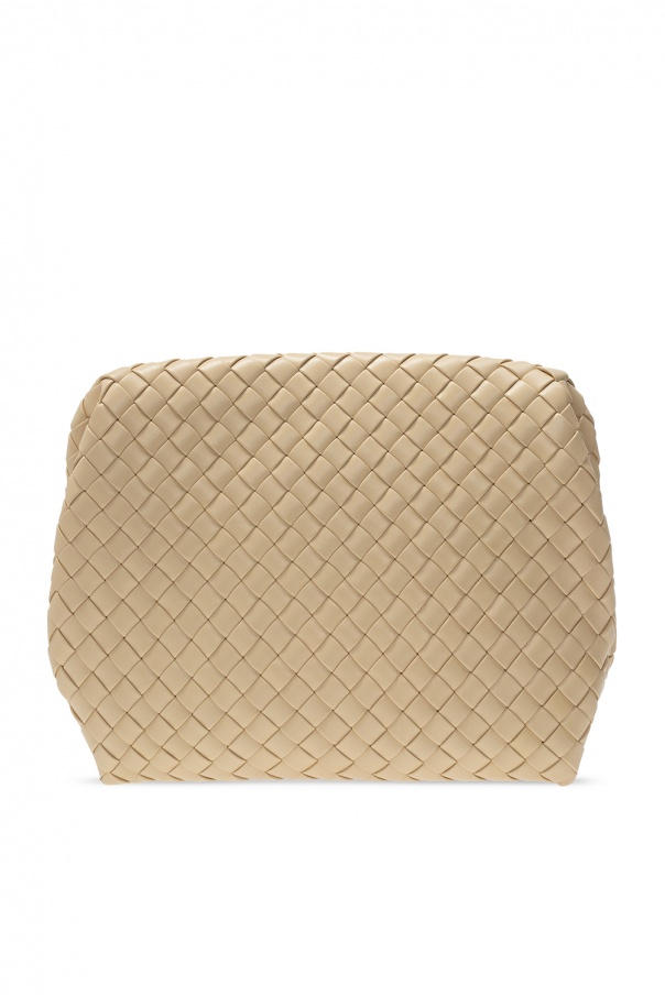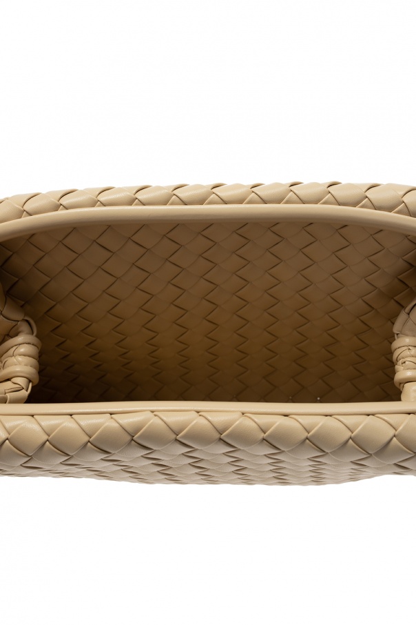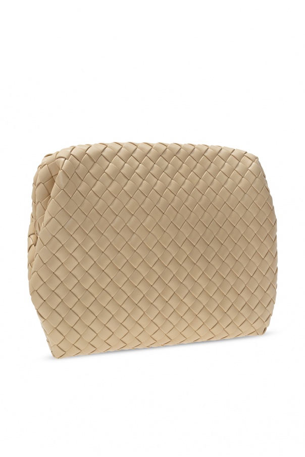 Beige 'Clasp' hand bag from Bottega Veneta. Size medium. Crafted from calf leather with the label's iconic 'Intrecciato' weave, this design is complete with magnetic fastener and one internal compartment.