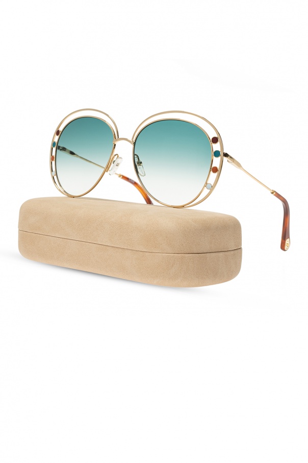 Gold-tone and brown ‘Rainbow Dot’ sunglasses from Chloé. Round frames decorated with colorful appliques. Signature cut-out detailing at the tips. Blue gradient lenses with 100% protection against UVA/UVB rays. Item comes with a protective case and a cleaning cloth.