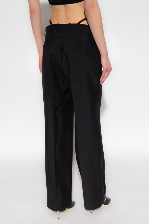 Black pleat-front trousers from Gucci. Crafted from a mohair and sheep wool blend, this pair falls with straight legs and features a zip fly with a button and hooks, two front slip pockets, two back button pockets and removable straps in calf leather with crystal-bejewelled ‘Square G’ hardware on the sides.