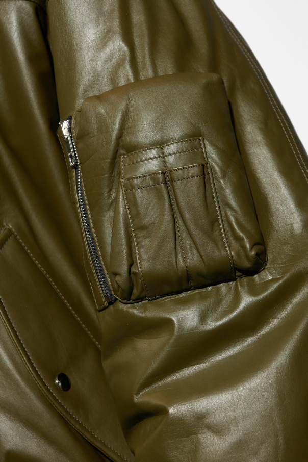 Green bomber jacket from Gucci. Made of cow leather, this garment features a zip fastening, two snap-fastened flap pockets and ribbed trims at the stand collar, hem and cuffs.