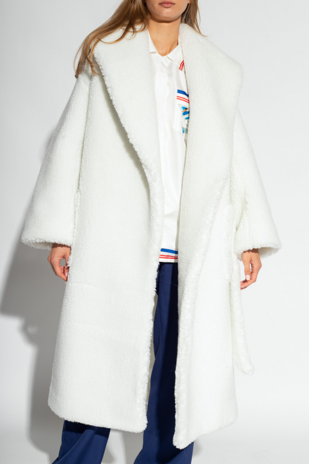 White coat from Casablanca. Crafted from faux fur sourced from recycled yarns, this item features an oversize shawl collar, two slip pockets, long sleeves and an attached waist-cinching belt.
