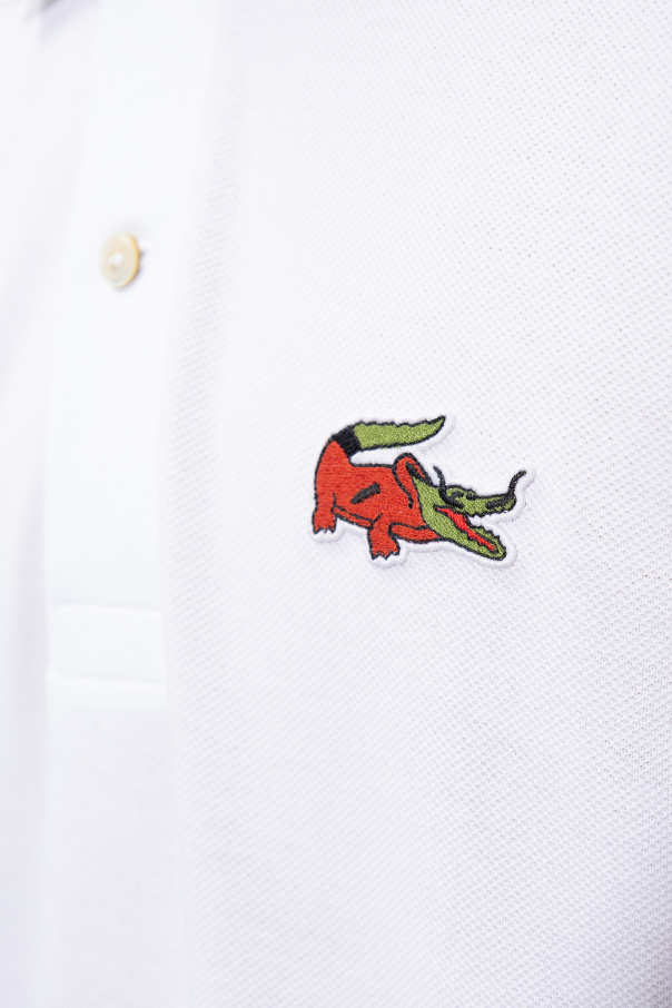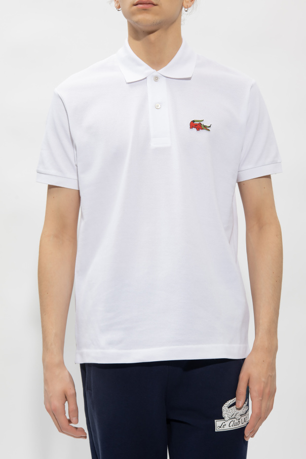 White polo shirt from Lacoste x Netflix. Made of organic cotton, this garment features a buttoned collar, short sleeves with ribbed edges and multicolored patch inspired by the show La Casa De Papel.