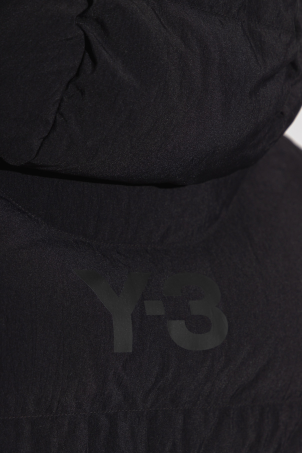 Black hooded quilted down jacket from Y-3 Yohji Yamamoto. Made of recycled Pertex® Quantum fabric, which is robust, windproof, water repellent and very breathable. This garment features a two-way zip, logo print at the back, two buttoned flap pockets, two zip pockets and drawstring hem.