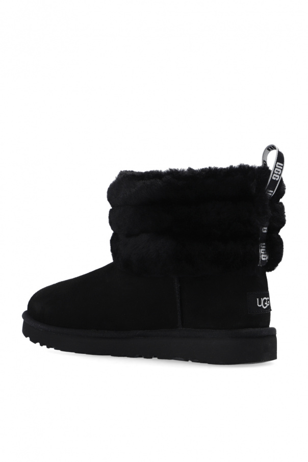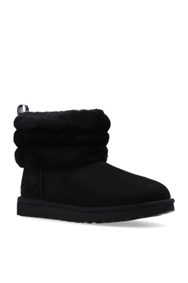 Black ‘Fluff Mini Quilted’ snow boots from UGG. Made of suede and insulated with sheep wool, this model features exposed stitching details, a black logo appliqué on the back and a textured sole in black EVA.
