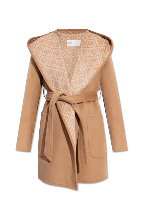 Brown coat with a hood from Tory Burch. Made from wool, this style is cinched with a tie belt at the waist and features a monogrammed lining, two slip pockets and long sleeves.