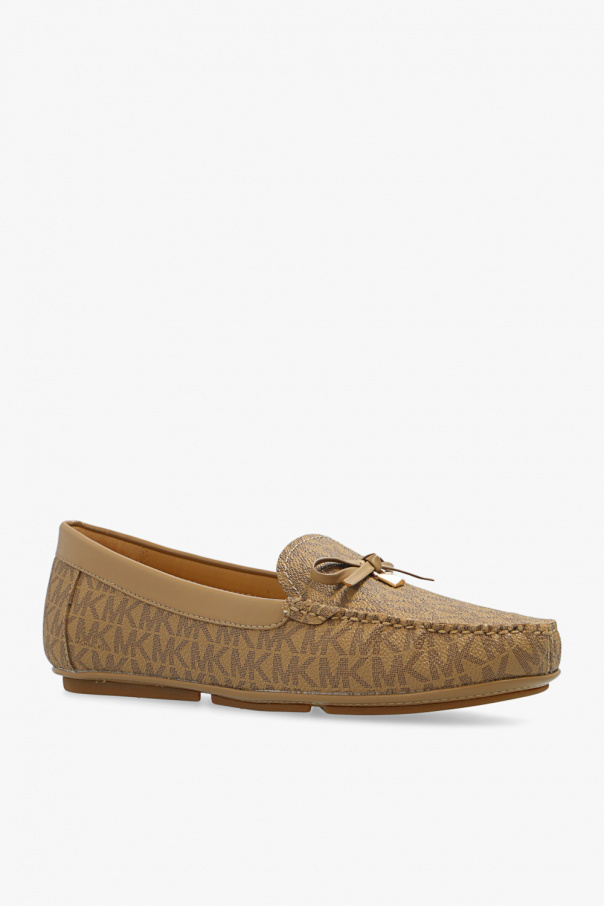 Light brown ‘Juliette’ loafers from Michael Michael Kors. Embellished with a monogram pattern, this model features a distinctive bow on the front and a light brown rubber sole at the base.