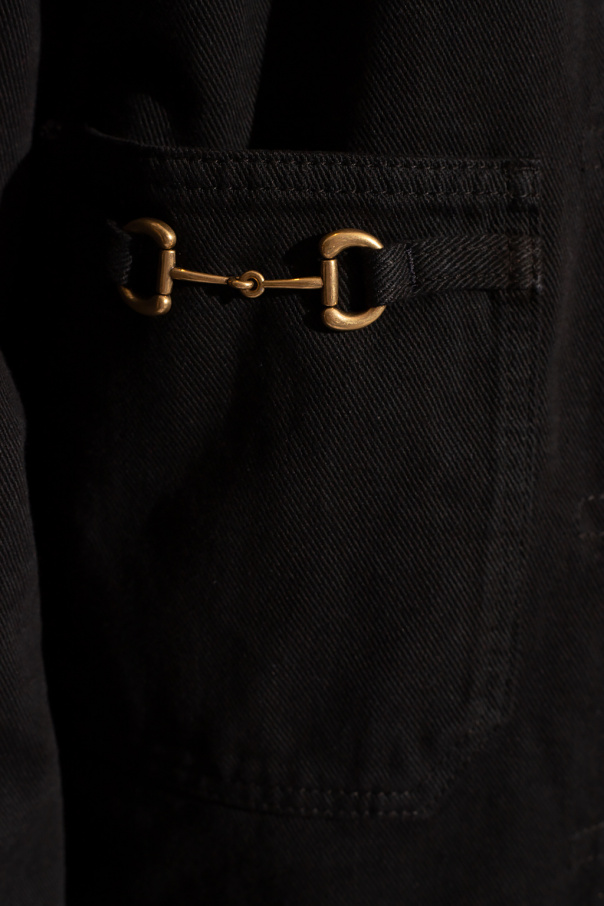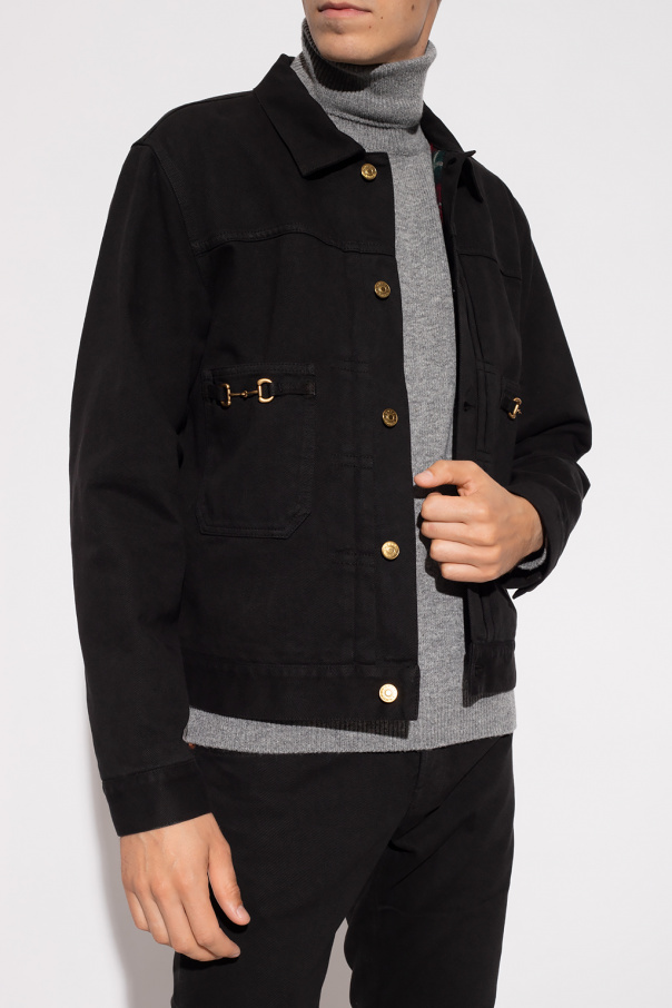 Black denim jacket from Gucci. Made from cotton, this style features gold-tone button closures, two frontal pockets emblazoned with the brand's signature gold-tone horsebit hardware, long sleeves with button cuffs, and a red wool lining with a colourful check pattern.