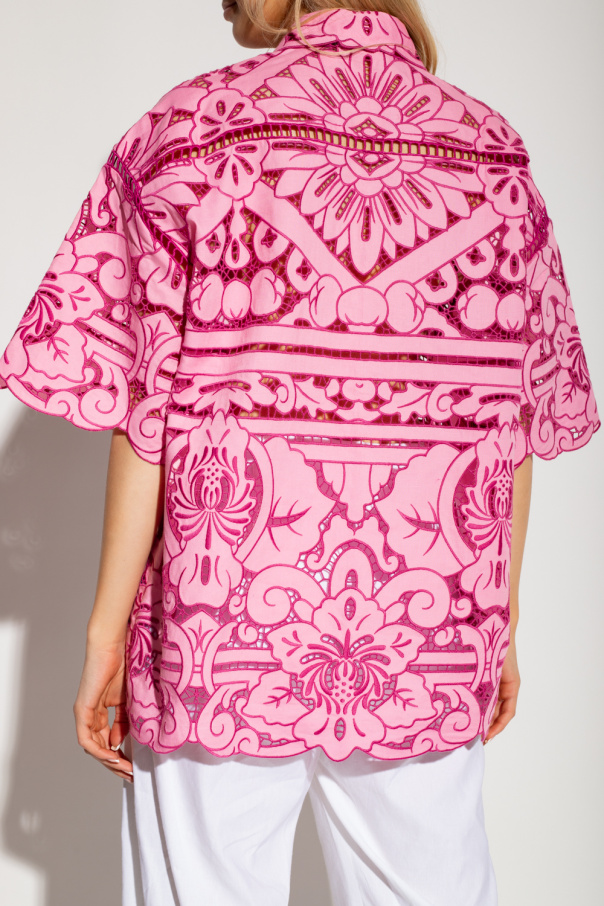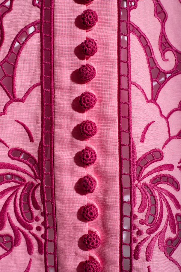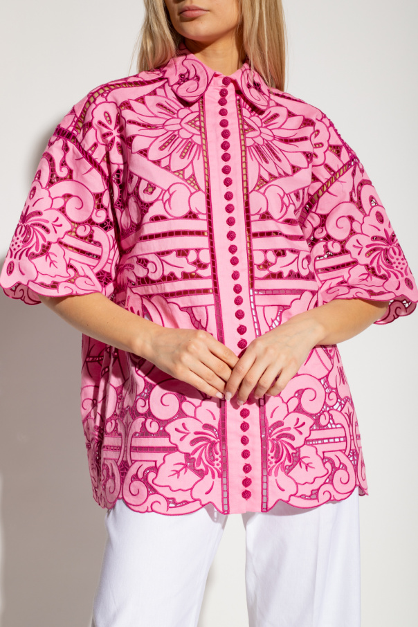 Pink ‘Jude’ shirt from Zimmermann. Crafted from a linen and cotton blend, this style showcases floral broderie anglaise detailing, button fastenings and short sleeves.