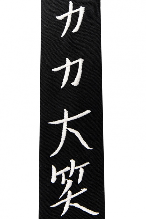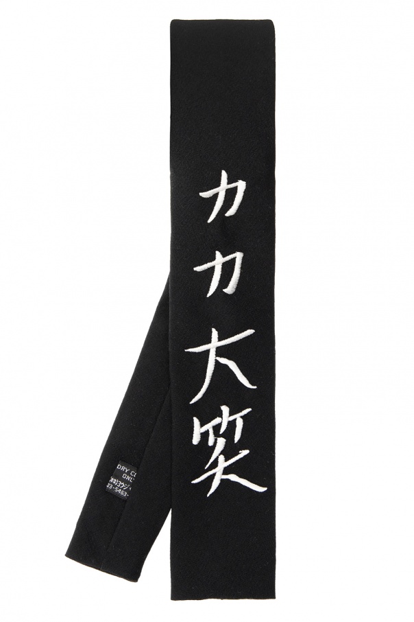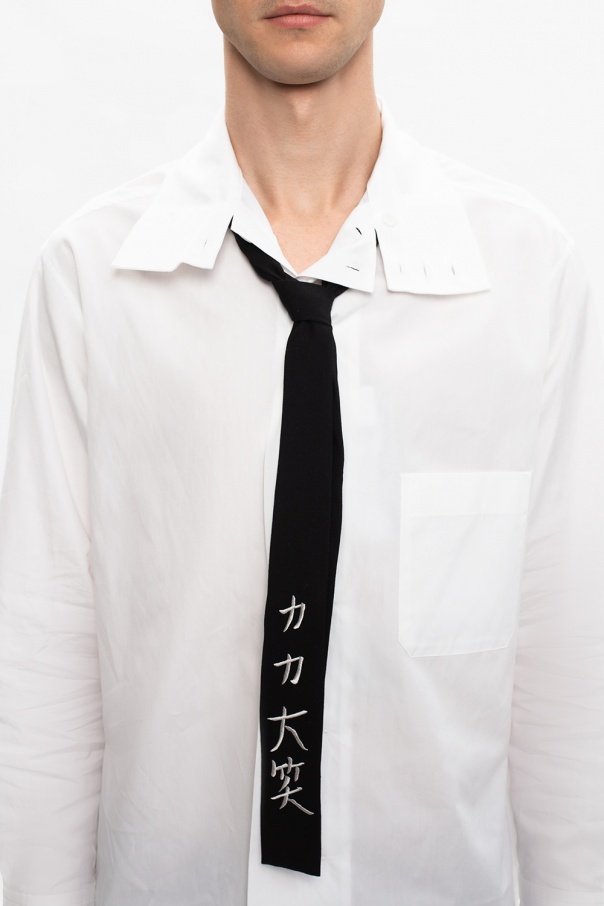Black tie from Yohji Yamamoto. Crafted from wool gabardine, this accessory showcases embroidered white detail.