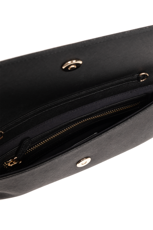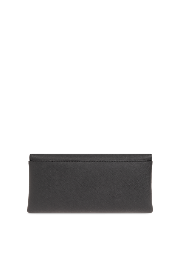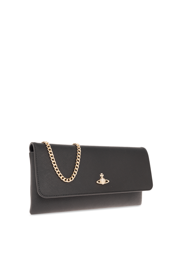 Black clutch from Vivienne Westwood. Made from faux leather, this item fastens via a zip and showcases a metal logo plaque on the front, gold-tone metal hardware as well as a detachable chain shoulder strap and one internal compartment with one zip pocket and one card slot.
