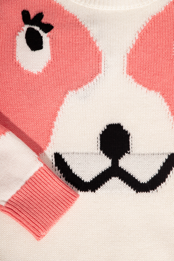 Cream and pink sweater from Stella McCartney Kids. Crafted from organic cotton and wool blend, this round neck design is enriched by an animal motif and ribbed trims.