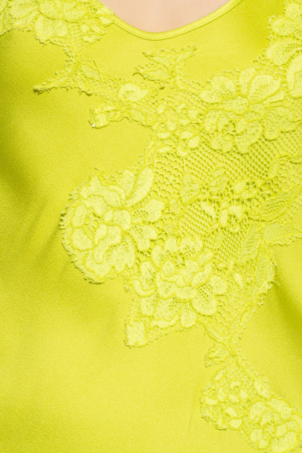 Light green maxi dress from Victoria Beckham. This design is enriched by lace appliqués, low cut back and decorative fringes at the shoulder straps.