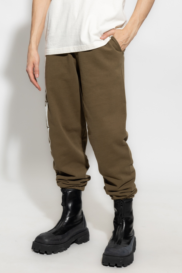 Green sweatpants from Heron Preston. Crafted from cotton, this pair features an elastic drawstring waistband, white logo print on the front, orange patch at the back, two slip pockets and ribbed cuffs.