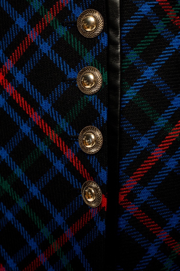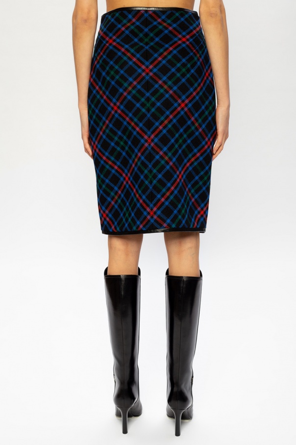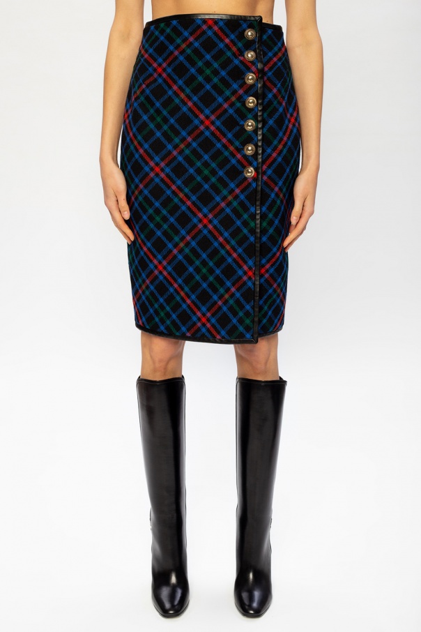 Black skirt from Saint Laurent. Knitted from wool with a colourful checked motif, this feminine garment fastens via buttons on the front and employs lamb leather trims.
