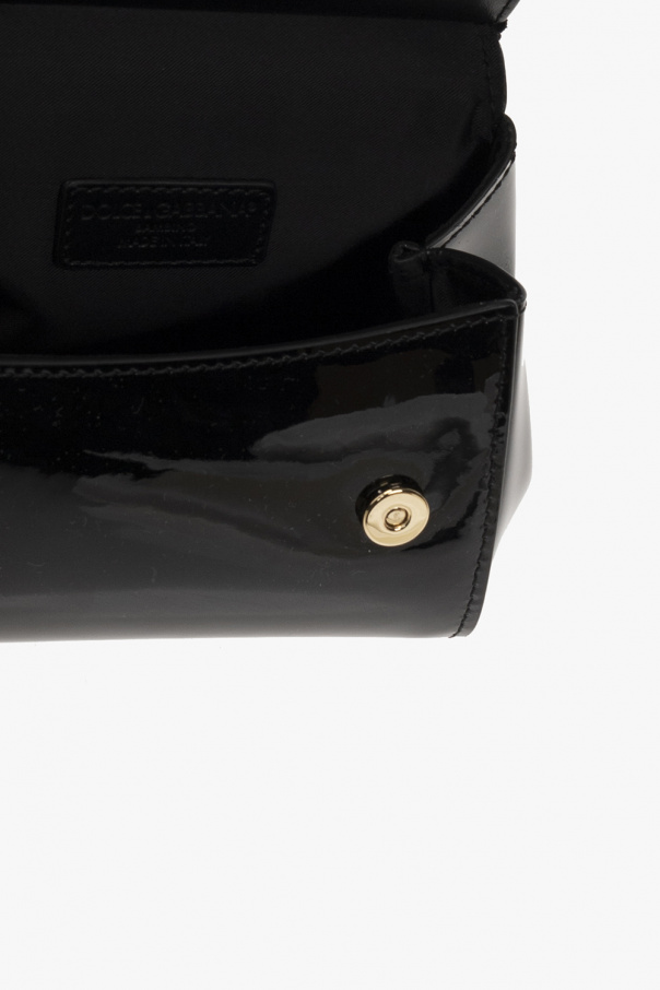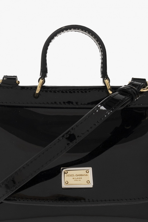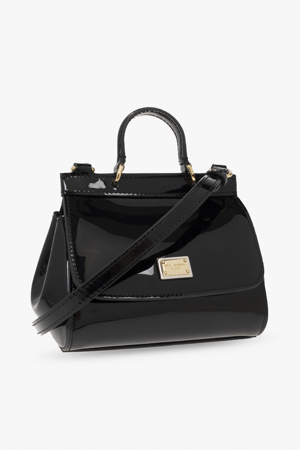 Black ‘Sicily’ shoulder bag from Dolce & Gabbana Kids. Crafted from patent calf leather, this model features snap fastenings, gold-tone logo appliqué, adjustable shoulder strap, half-round handle, one internal compartment and gold-tone metal hardware.