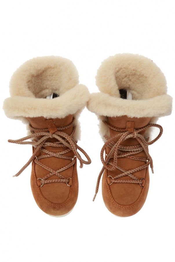 Brown and beige ‘Far Side’ lace-up snow boots from Moon Boot. Made of suede. Finished with faux-shearling. They feature embossed logo on the rear and brown and beige rubber sole at the base.