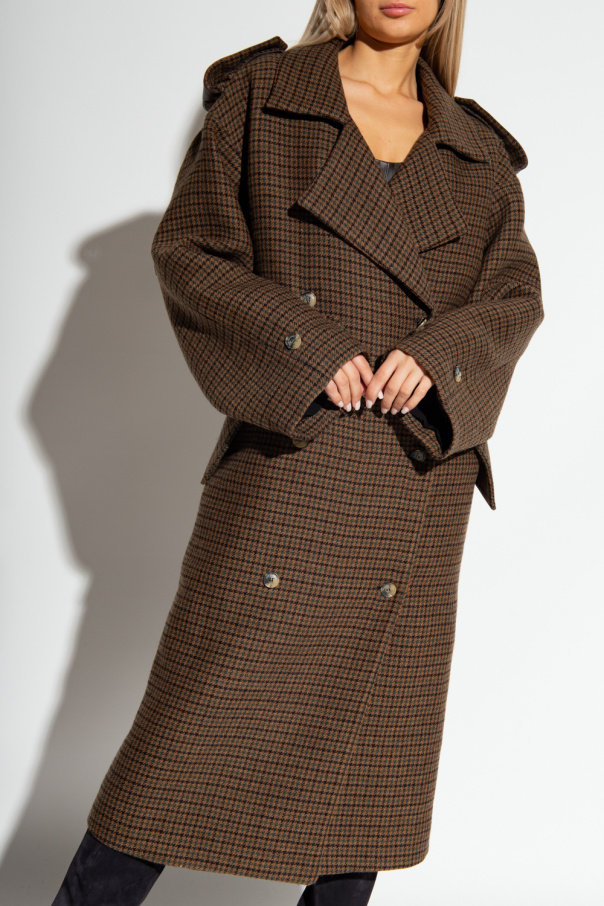 Brown, black and green ‘Shamali’ coat from The Mannei. Crafted with an oversize, double-breasted silhouette, this style features a houndstooth check pattern, button fastenings, a vast collar with notch lapels cascading down onto shoulders, leather epaulettes with buttons, two slip pockets, a single back vent and long sleeves with button straps.