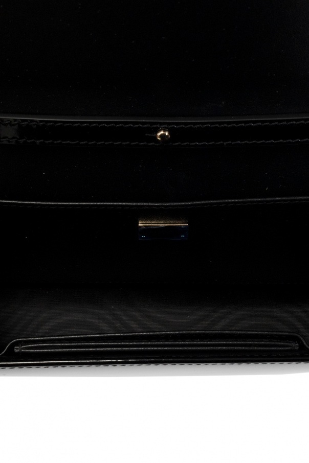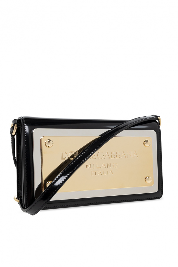 Black phone holder from Dolce & Gabbana. Crafted from patent calf leather, this model features magnetic snap fastenings, gold-tone and silver-tone engraved logo, detachable and adjustable strap, gold-tone metal hardware and one internal compartment with two slip pockets. Comes with a card holder with three card slots.