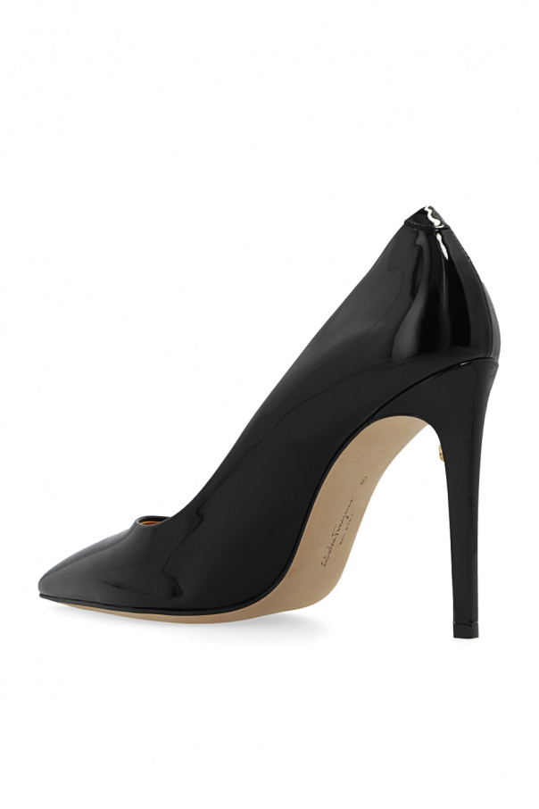 Black ‘Ilary’ pumps from Salvatore Ferragamo. Made of patent calf leather, this model features a pointed toe and a beige leather sole.