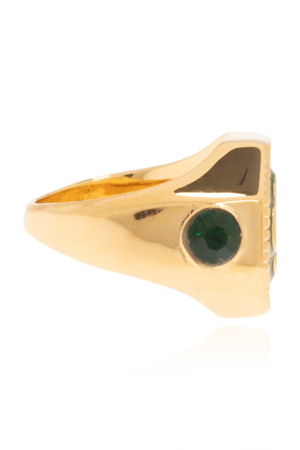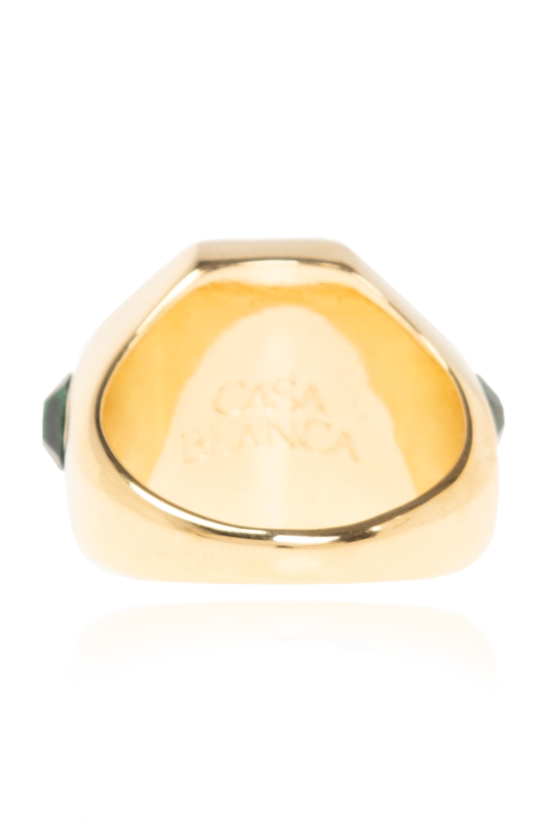 Gold-tone and green ring from Casablanca. Made from gold-plated brass, this item showcases a diamond logo and sparkling crystals.