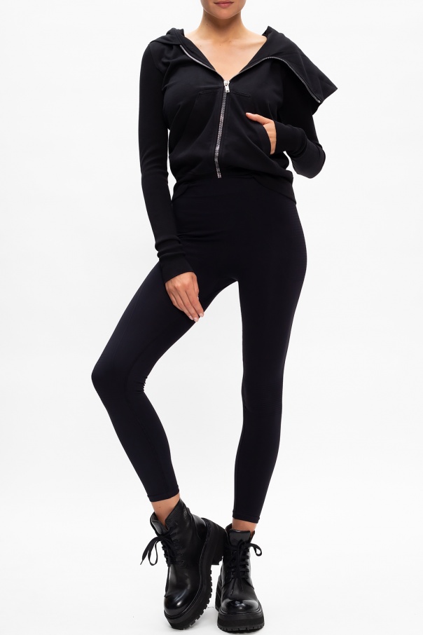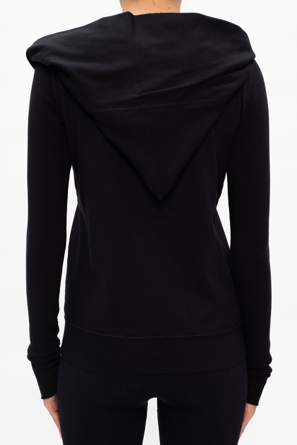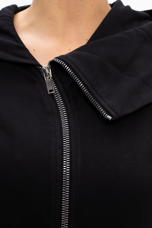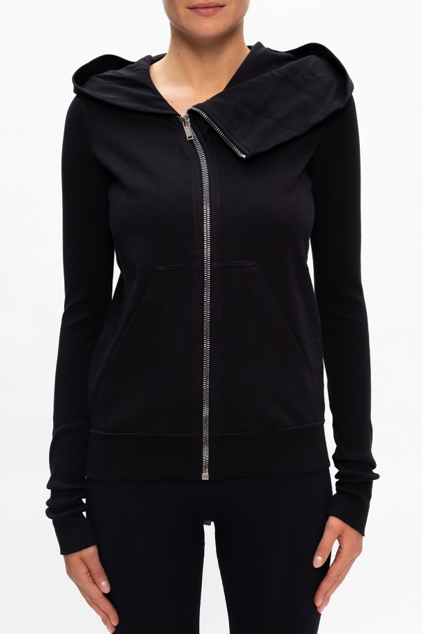 Black long hoodie from Rick Owens DRKSHDW. Crafted from textured cotton, this design features an asymmetrical zip fastening, two slip pockets and ribbed trims.