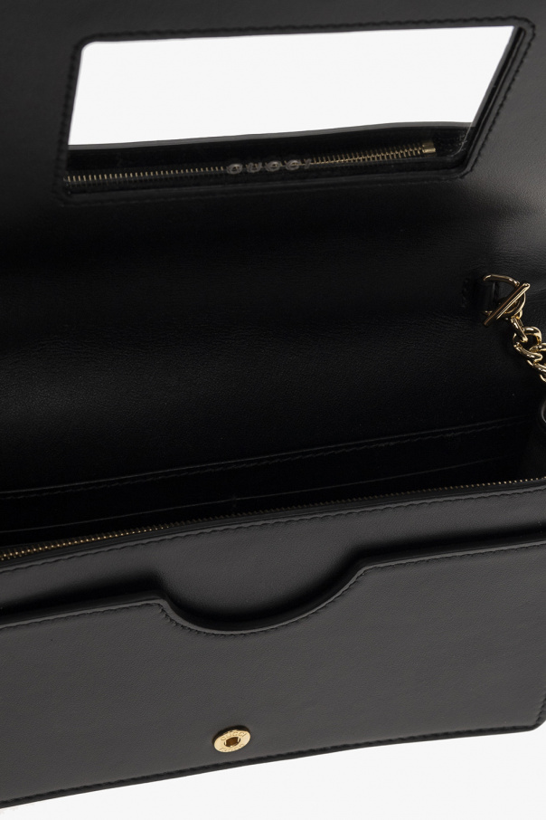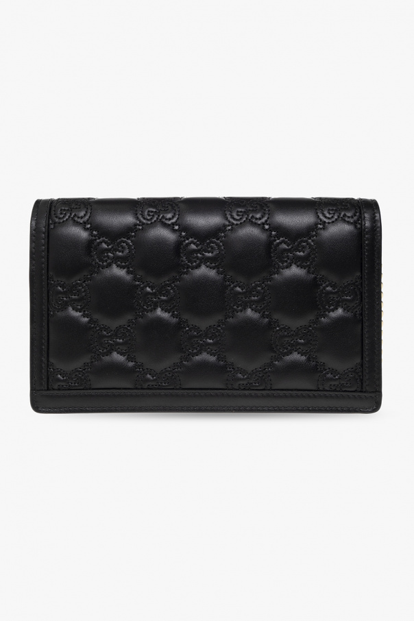 Black wallet from Gucci. Made of GG Matelasse leather, this model is complete with a flap with a snap closure, metal logo appliqué, detachable shoulder chain and gold-tone metal hardware. One internal compartment with one zip pocket, two slip pockets, six card slots and a mirror inside.